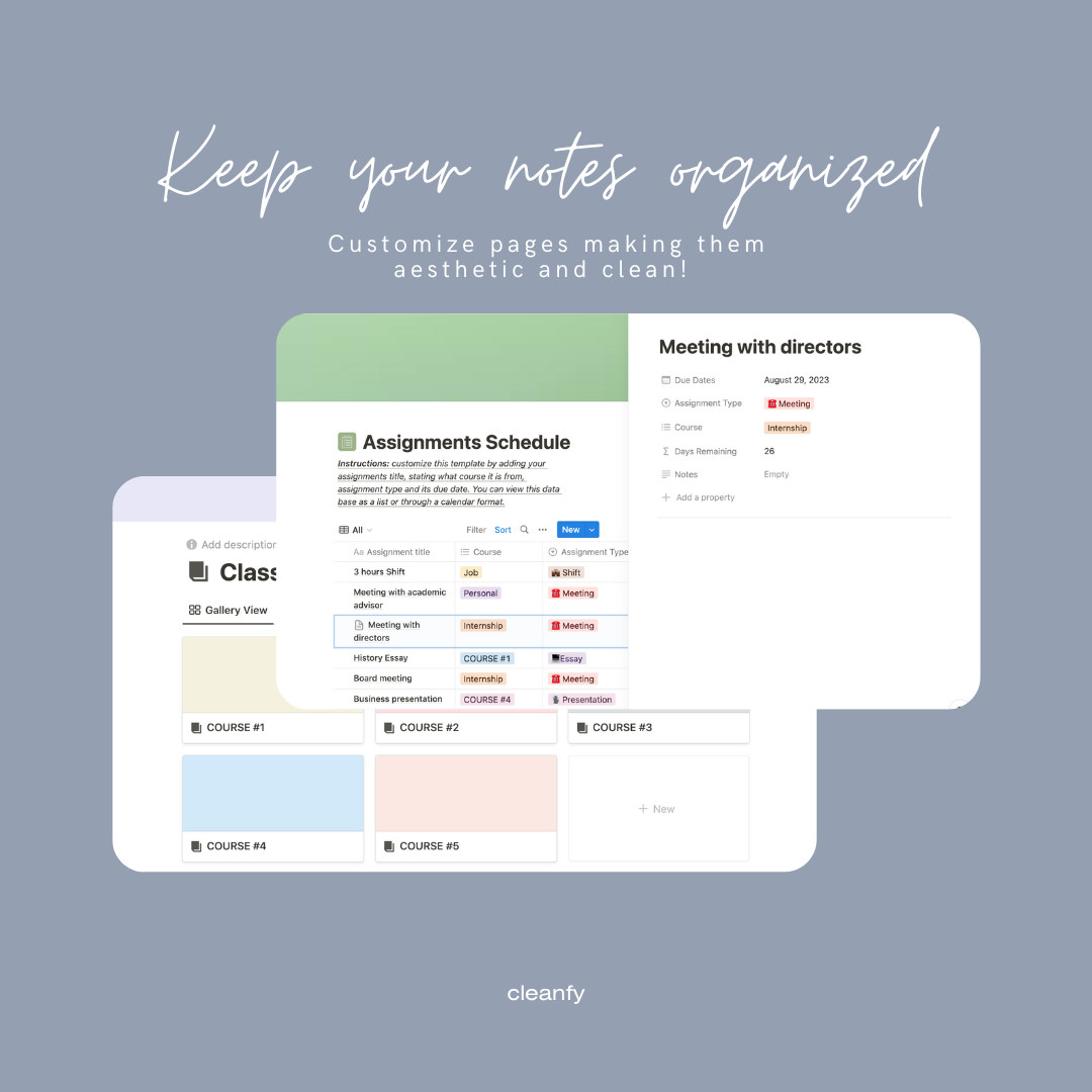 - Class notes menu page with 5 customizable courses pages