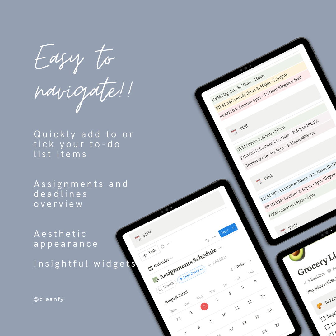 All-In-One Dashboard, Assignment Tracker, Class Notes Menu, Grocery Shopping List